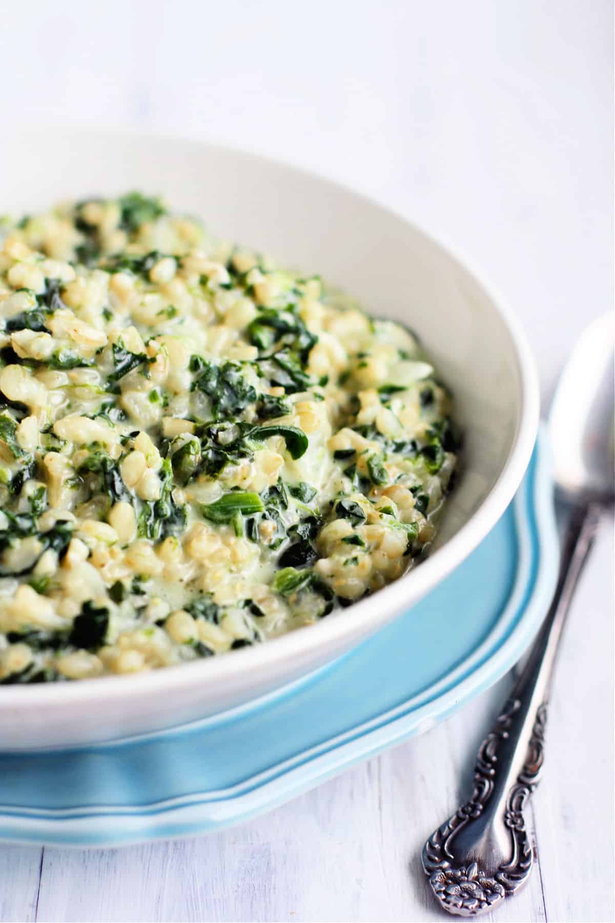 Cheesy garlic spinach rice is cozy, flavorful, dairy free and gluten free comfort food. Perfect for an easy weeknight meal!