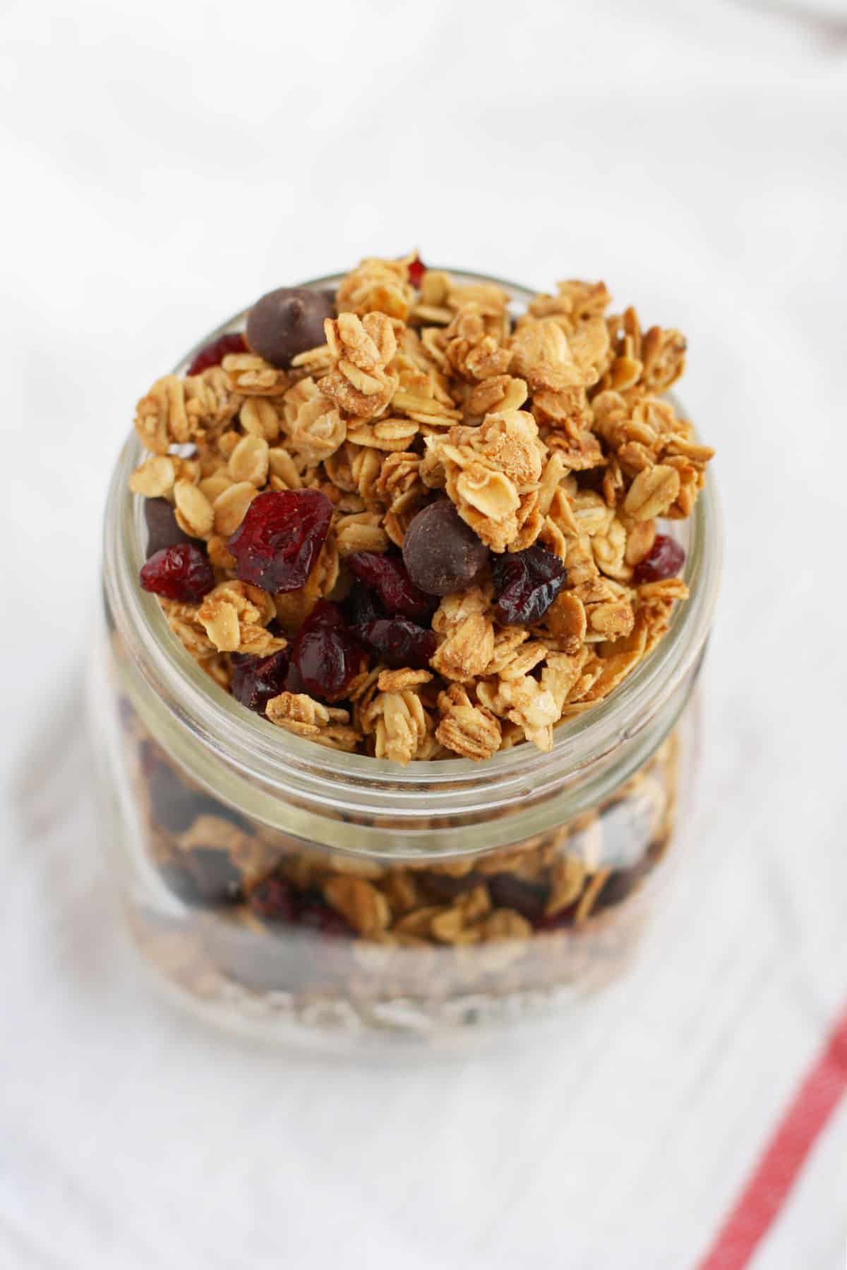 Chocolate chip cranberry granola is a great breakfast or after school snack. Buttery granola, chocolate chips, and chewy cranberries make this an irresistible breakfast! This can even be packaged up in a Mason jar for gift giving!