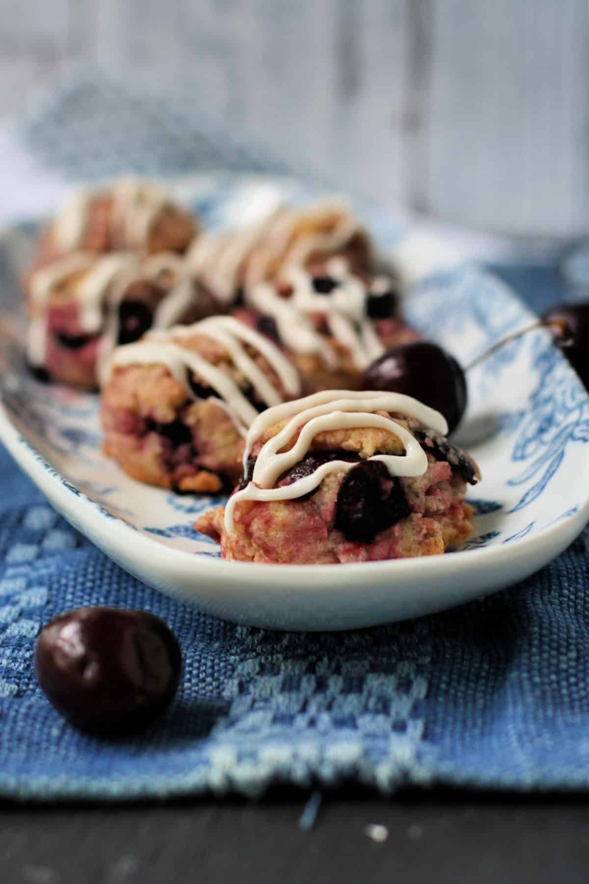 Fresh Bing cherries are the perfect addition to these soft gluten free cookies. These are easy to make, and a good way to use up summer cherries! A white chocolate drizzle is the perfect finishing touch.